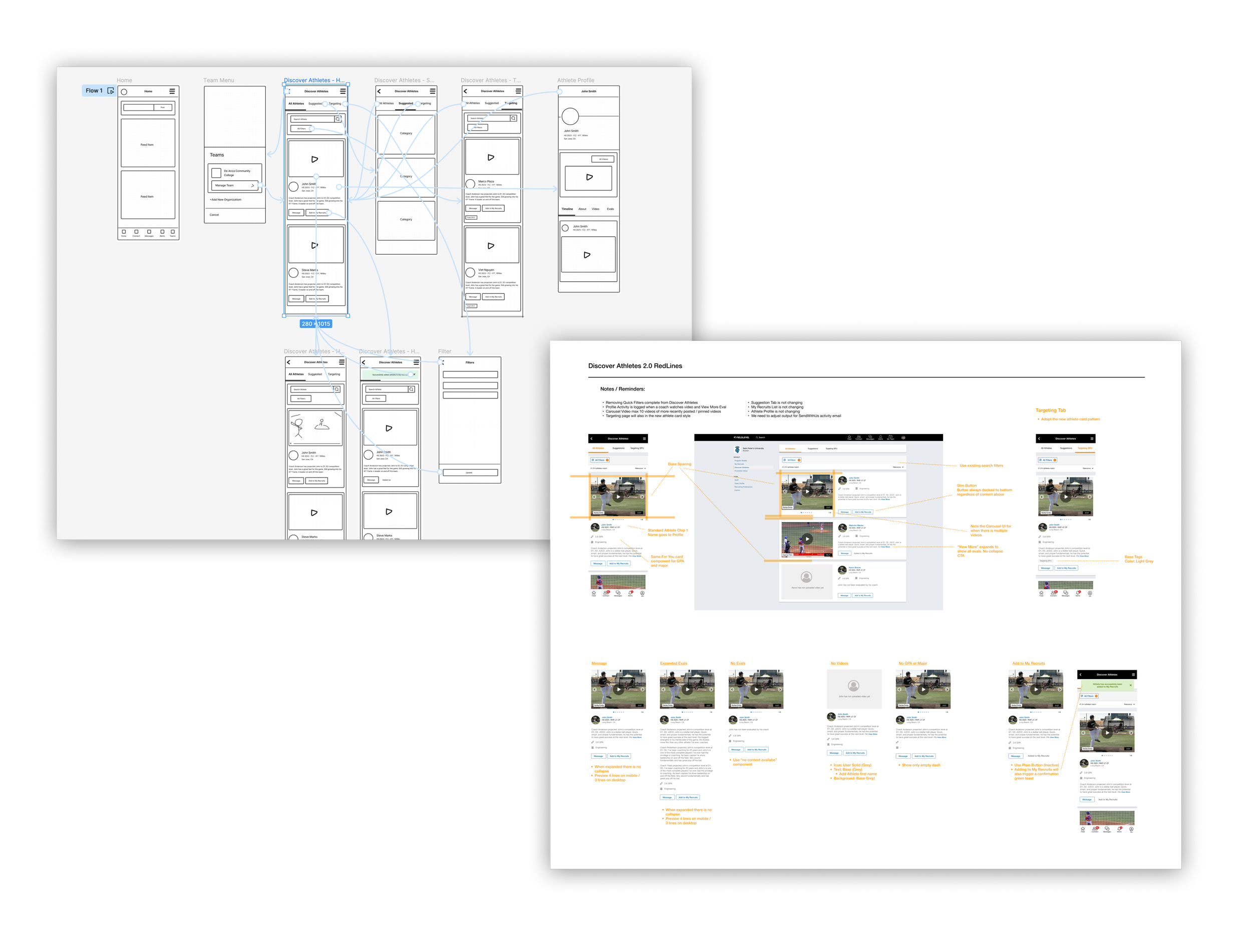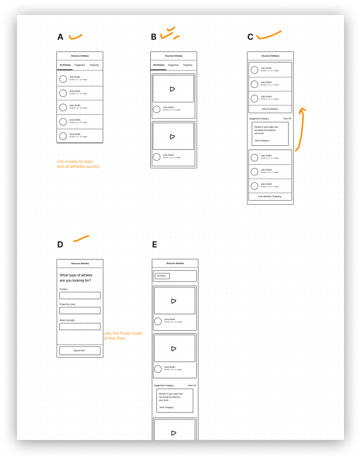 For this project, it was essential to document all the paths a college coach was getting to the Discover Athletes area, whether from email and push notifications, the home feed, or another location.