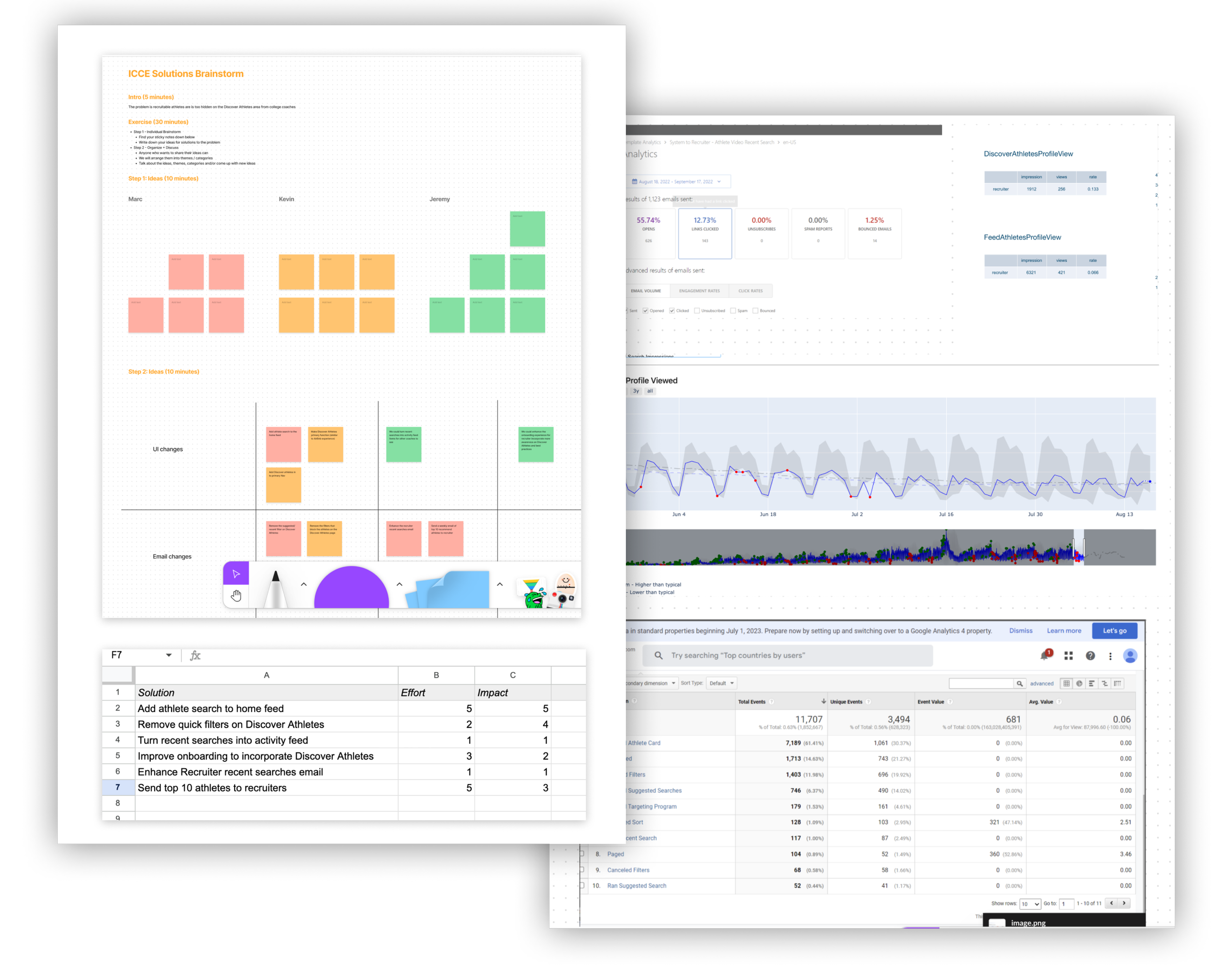 Our data and engineering team members begin looking at impressions and unique visits on both the Discover Athletes and Home Feed. While the PM and Designer start making user feedback calls to college coaches. We also used Google Analytics to view the usage of the current quick filter screen on the Discover Athlete area that blocks the list of recruitable athletes.